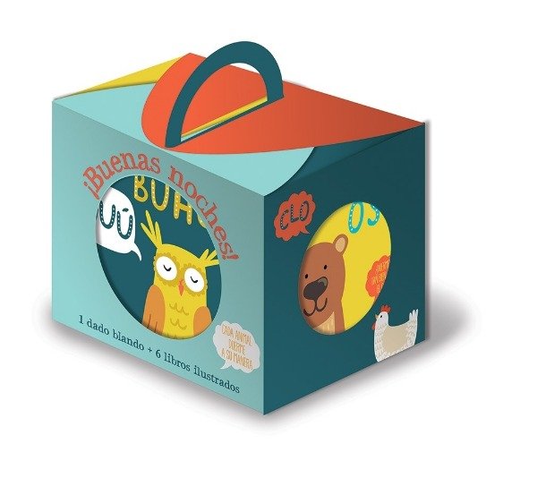 Se trata de un objeto, un juguete. Consta de una caja calada dentro de la que vienen seis libros pequeños y un dado blando. El bebé lanza el dado y la cara que queda mirando hacia arrriba determina que librito se lee. En este título, ¡Buenas noches!, el pingüno, la gallina, el osos, el zorro y el búho nos cuentan cómo se van a dormir y nos dan las buenas noches.